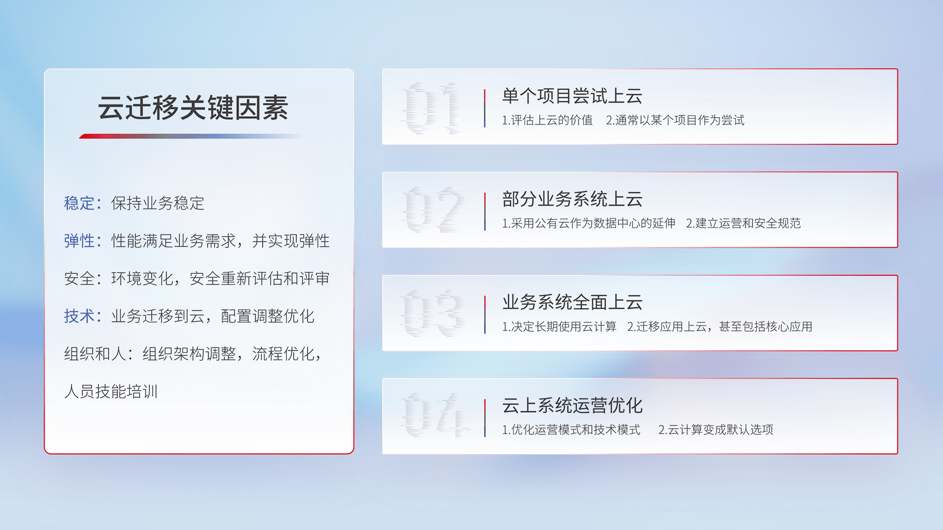 结合实际业务,,,从规划设计、、、云平台选型、、云原生改造、、、数据迁移、、、集成交付,,,,迁移全过程为客户识别最佳上云路径,,,,做好风险识别管理,,,设计网络架构、、、、身份权限、、安全审计合规、、、、操作审计、、、日志审计、、、监控告警策略、、多站点容灾设计等,,,对云上基础设施进行整体规划,,提升IT治理水平,,,,以满足弹性、、、高可用、、高性能的需求。。。
