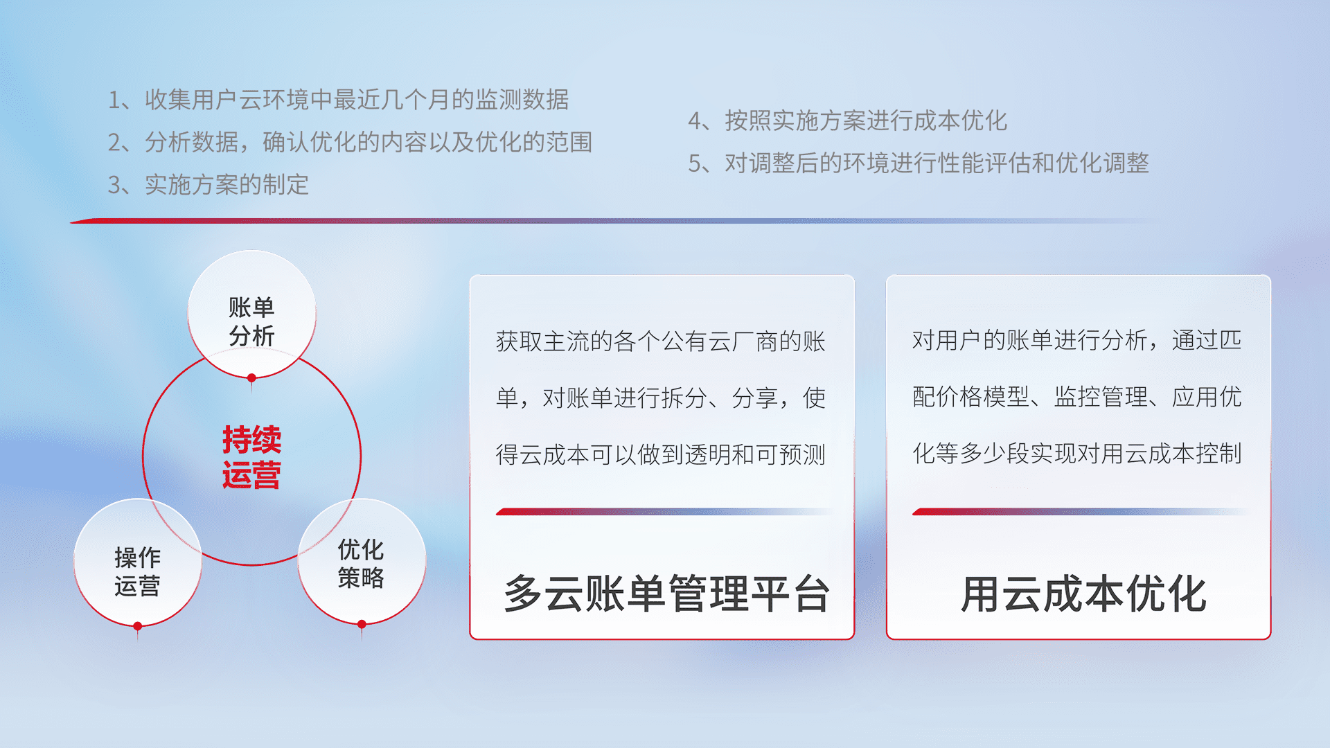 通过多云纳管,,以统一的资源数据模型把客户的云资源进行抽象和封装,,,,进而实现对多云资源的统一操作,,,,保障云资源管理的可靠性、、、、稳定性与可用性。。。。量身定制化运维内容,,,,配置、、、开发运维、、、补丁管理、、、、备份、、、、监控、、认证和访问管理、、审计和日常巡检等,,保障在用云过程中的可靠度,,,,稳定度以及高可用率。。。